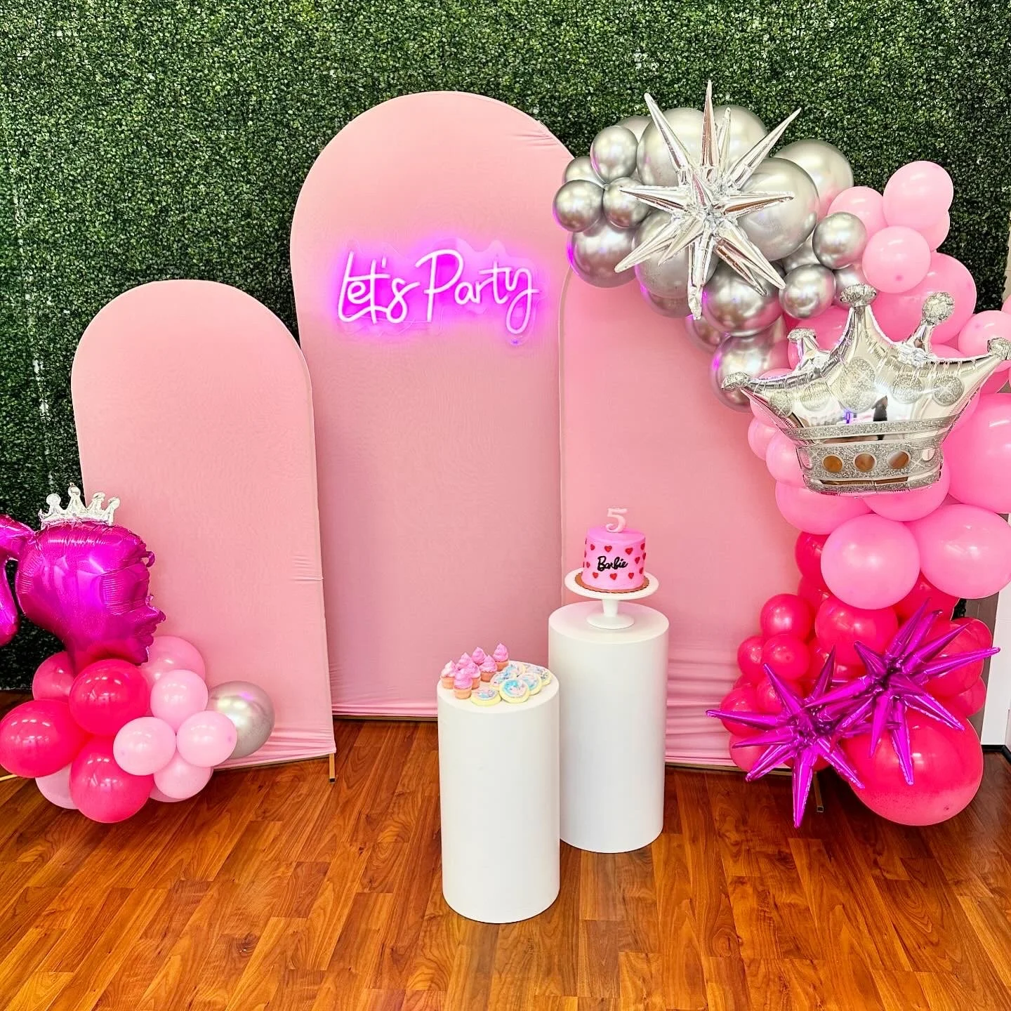 The main backdrop featured a glowing Let’s Party neon sign with bold pink balloons, silver accents, and the cutest Barbie-inspired setup. It was bright, happy, and such a fun focal point for cake time and photos. The pink cake tied everything together perfectly, and the whole room felt festive the moment guests walked in.